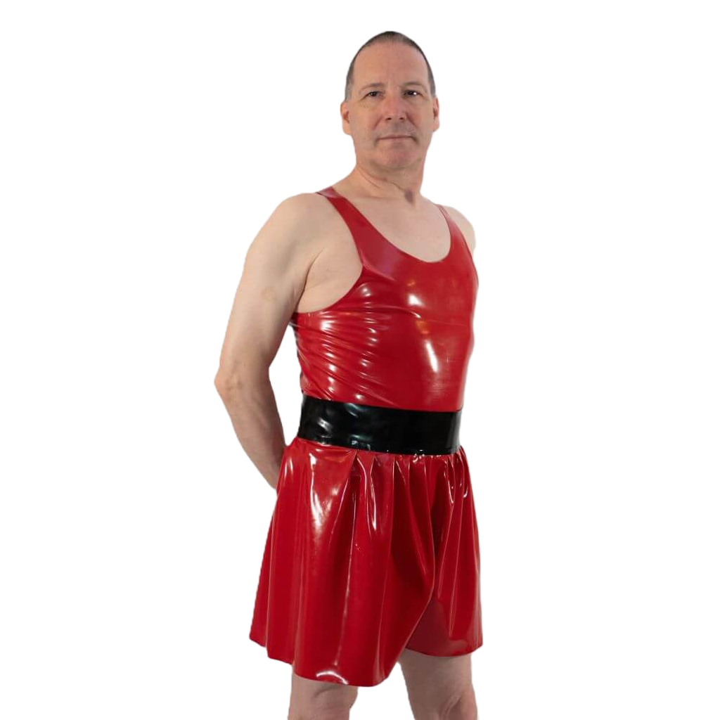 For those who desire a customized fit, we offer a “Made to Measure” option to ensure your outfit fits perfectly. Additionally, both the shorts and the vest can be chlorinated upon request, providing a silky-smooth finish that enhances the wearing experience. To add an extra touch of shine, consider using our [Vivishine polisher](https://www.latexandlovers.co.uk/latex-clothing/vivishine-latex-polish/), which will make your latex outfit gleam brilliantly.
