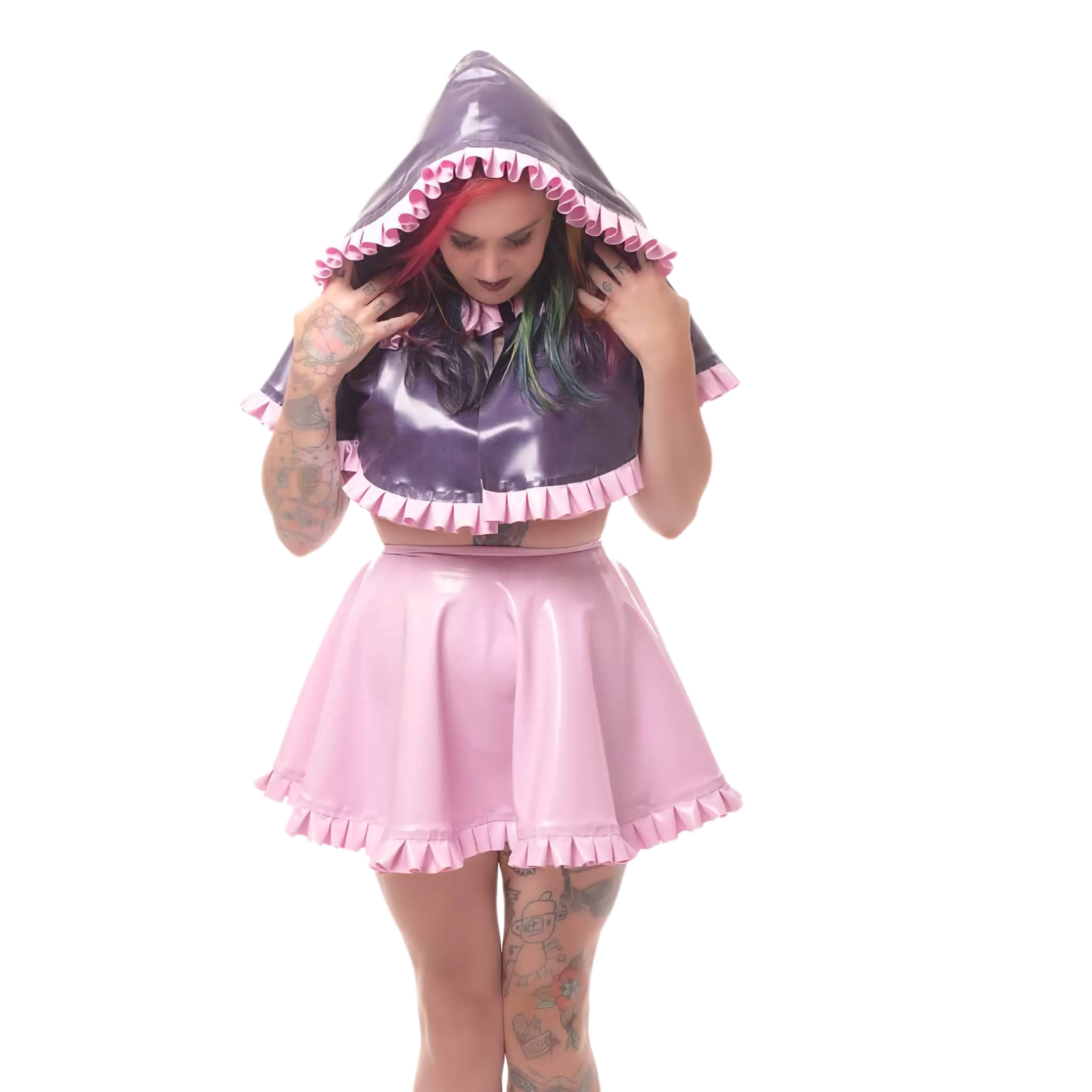 The set includes a short circle skirt paired with a stylish short cape, both adorned with delicate frills around the edges, adding a touch of elegance to the edgy design. Crafted from premium latex with a thickness of 0.40mm, it offers both durability and a comfortable fit. If you’re unsure of your size, you can opt for the “Made to Measure” option from the size menu to ensure a perfect fit tailored just for you.