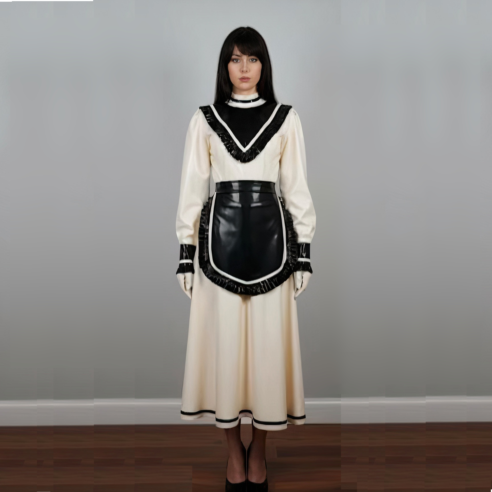 The Latex Rubber Maid Dress – Miss Frederica features a captivating V-shaped neckline, long sleeves with cuffs, and delicate frills that add a touch of playfulness. A contrast line at the bottom of the dress and around the neck enhances its charm, while a convenient zip at the back ensures ease of wear.