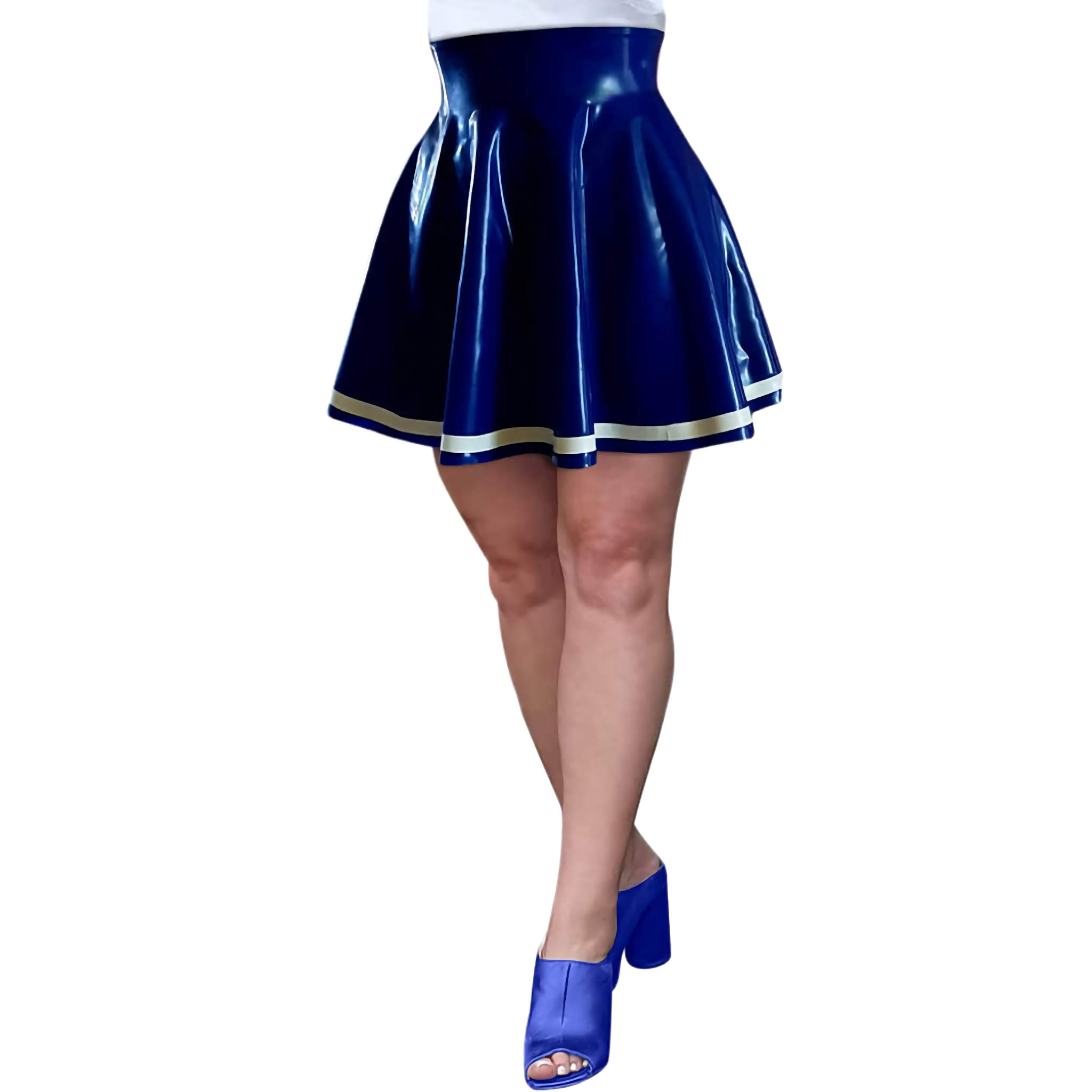 Introducing the Latex Full Circle Skirt from Latexandlovers, designed for those who crave a bold and striking look. This stylish latex skirt is perfect for parties or intimate occasions, combining high-quality craftsmanship with edgy design. Made from premium latex with a thickness of 0.40mm, this skirt features a flattering high-waisted fit with a 2.5-inch (6cm) waistband for added comfort. The full circle shape flows beautifully with every movement, while the glossy latex surface catches the light, creating a sleek and polished appearance. Measuring approximately 11 inches in length, the skirt is accented by a contrasting white hem trim for an extra touch of style.