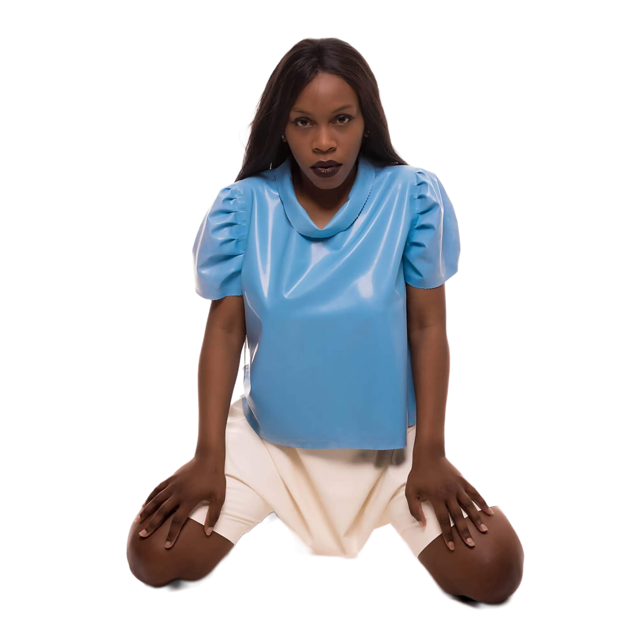 Latex Rubber Fifi’s Top/ Blouse is finished with puff sleeves, a round golf-style collar and zip at the back.